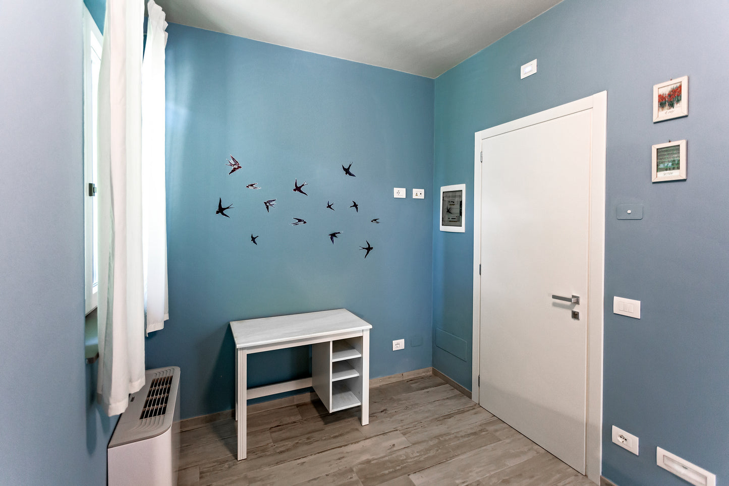 The Ortensia single room, located on the first floor, is an oasis of peace and serenity, where blue dominates the scene, creating a welcoming and inviting atmosphere.