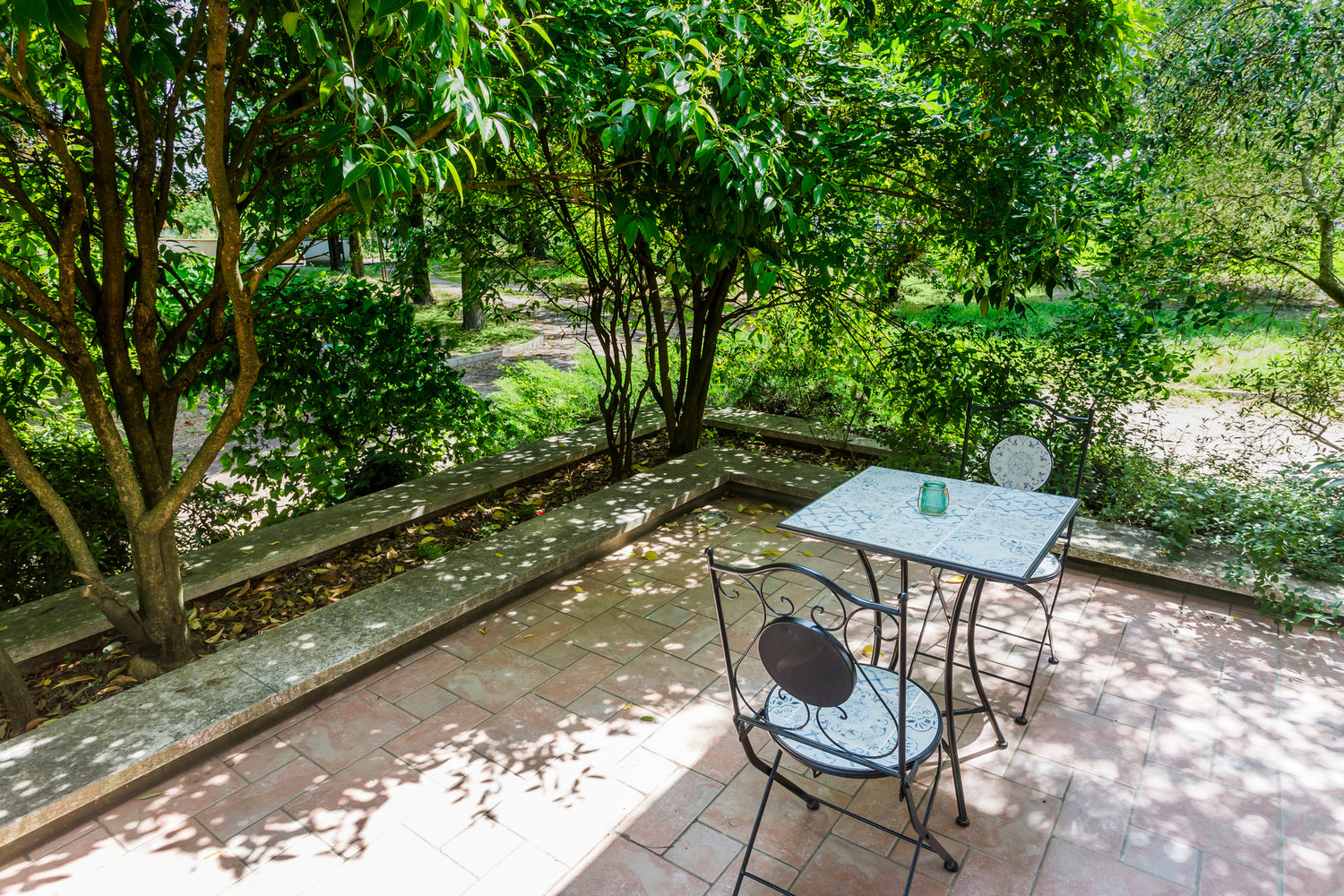 Al centro del portico, dove l'ombra fresca degli alberi del giardino crea un'oasi di pace, si trovano tavolini e divanetti che invitano a sorseggiare un caffè mattutino immersi nel verde.