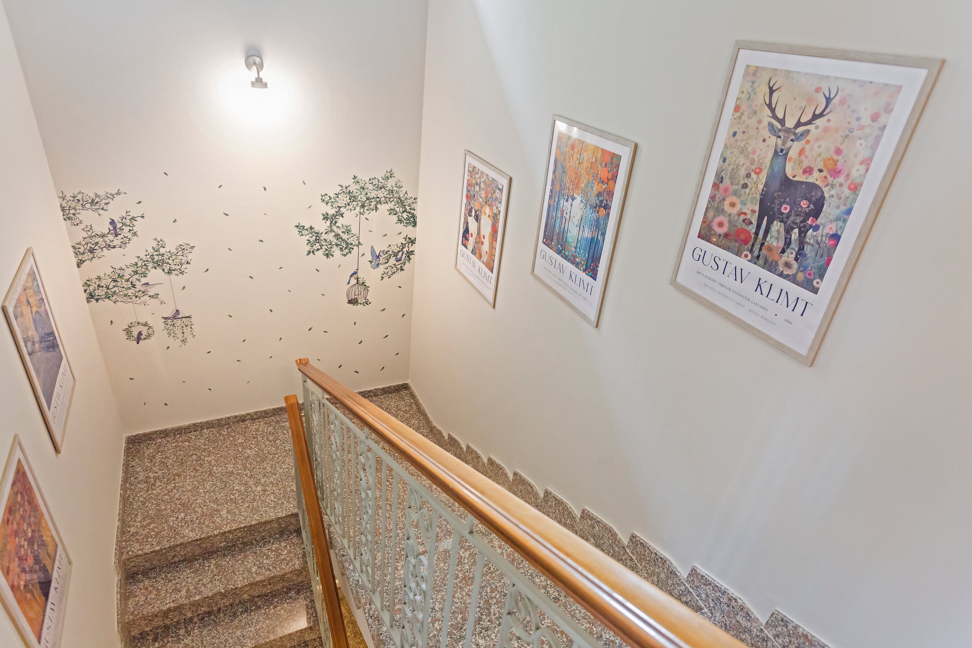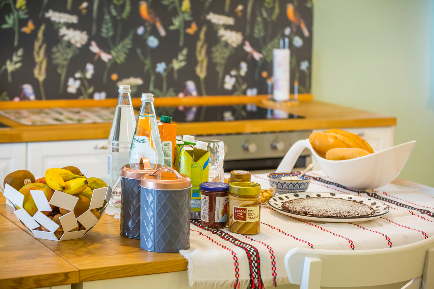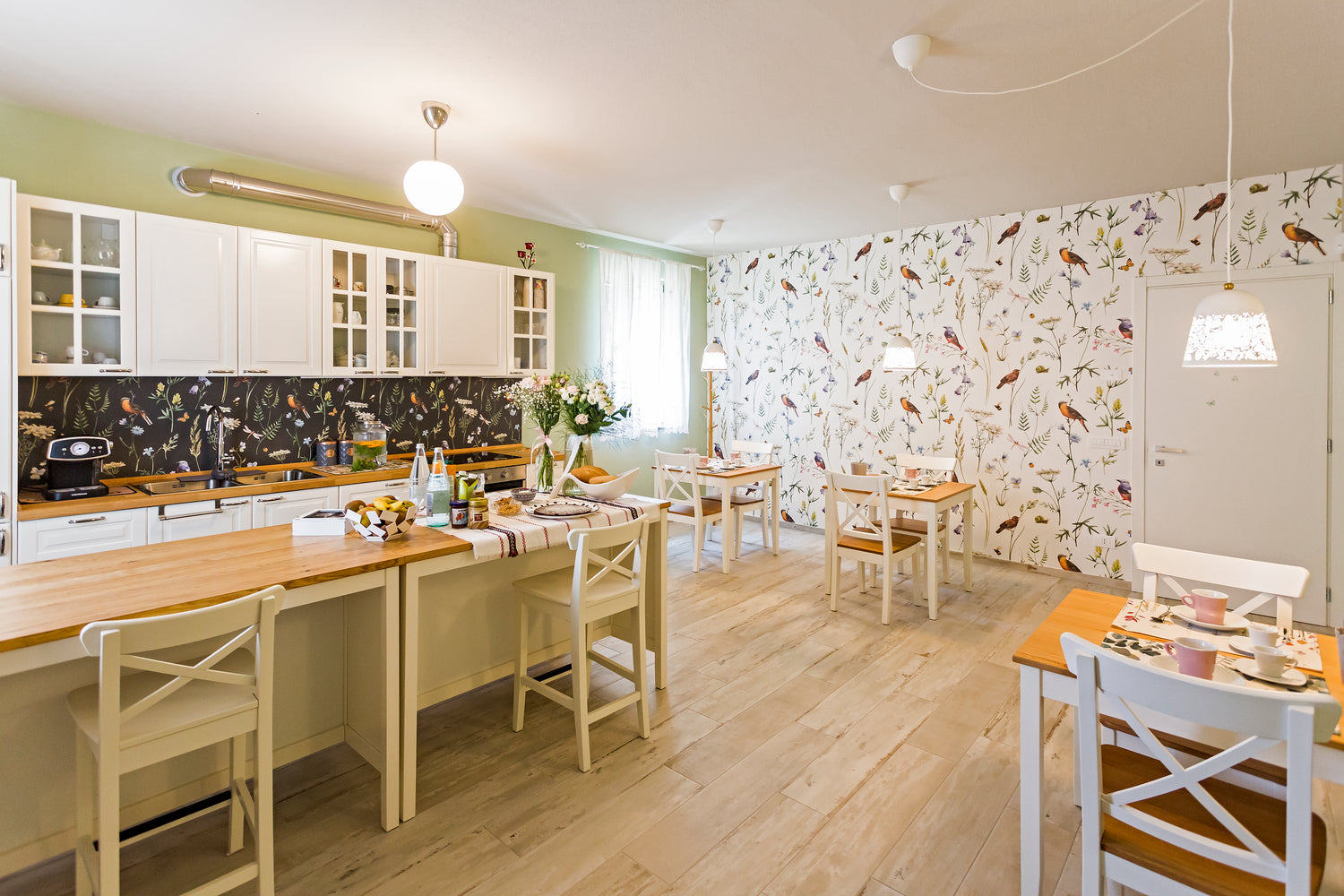 Ogni ambiente è stato curato nei minimi particolari, con un design moderno e raffinato che si fonde armoniosamente con i preziosi elementi architettonici originali. La scelta dei colori e dei materiali, unitamente ad un’illuminazione sapientemente studiata, contribuiscono a creare un'atmosfera calda ed accogliente. Dalla porta d’ingresso si accede alla cucina ampia e luminosa, dove lo stile shabby chic regna sovrano, creando un raffinato ambiente ricco di gusto, dai dettagli ricercati. La sala colazioni ha un tocco di eleganza rustica: coniuga rispetto dell’ambiente e design grazie alla scelta di materiali naturali come legno di colore bianco e superfici in legno grezzo. Il forno e il piano cottura ad induzione sono collegati ai pannelli fotovoltaici, permettendo di cucinare con basso impatto ambientale. Sulle pareti una carta da parati con graziosi disegni di flora e fauna dai toni delicati crea un'atmosfera allegra, unitamente ai lampadari dal look originale.
