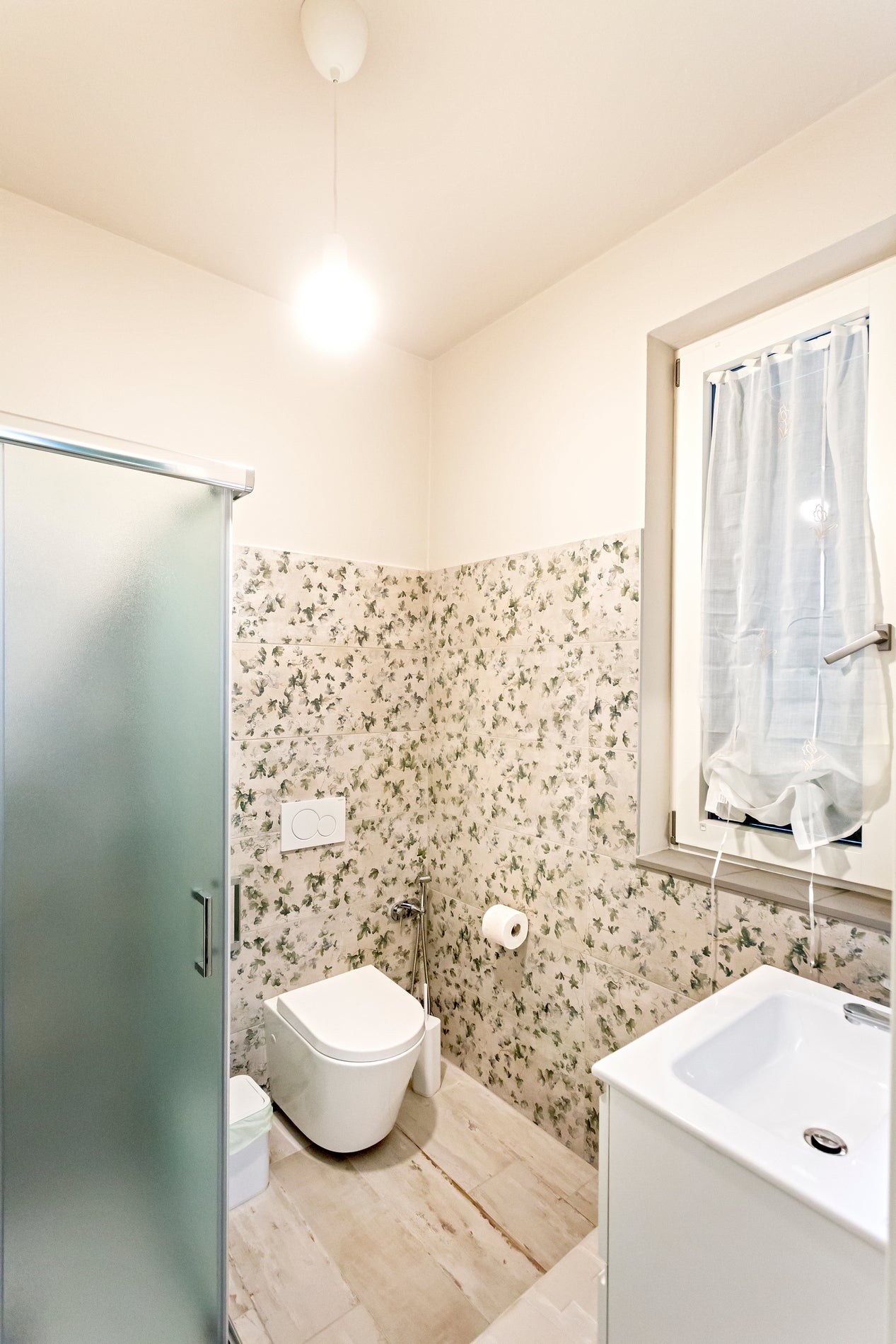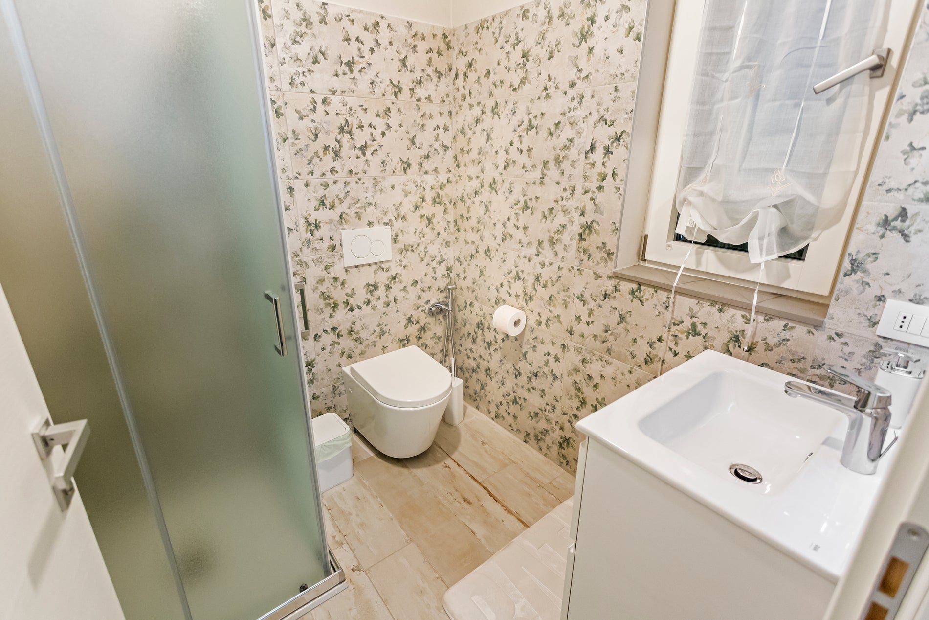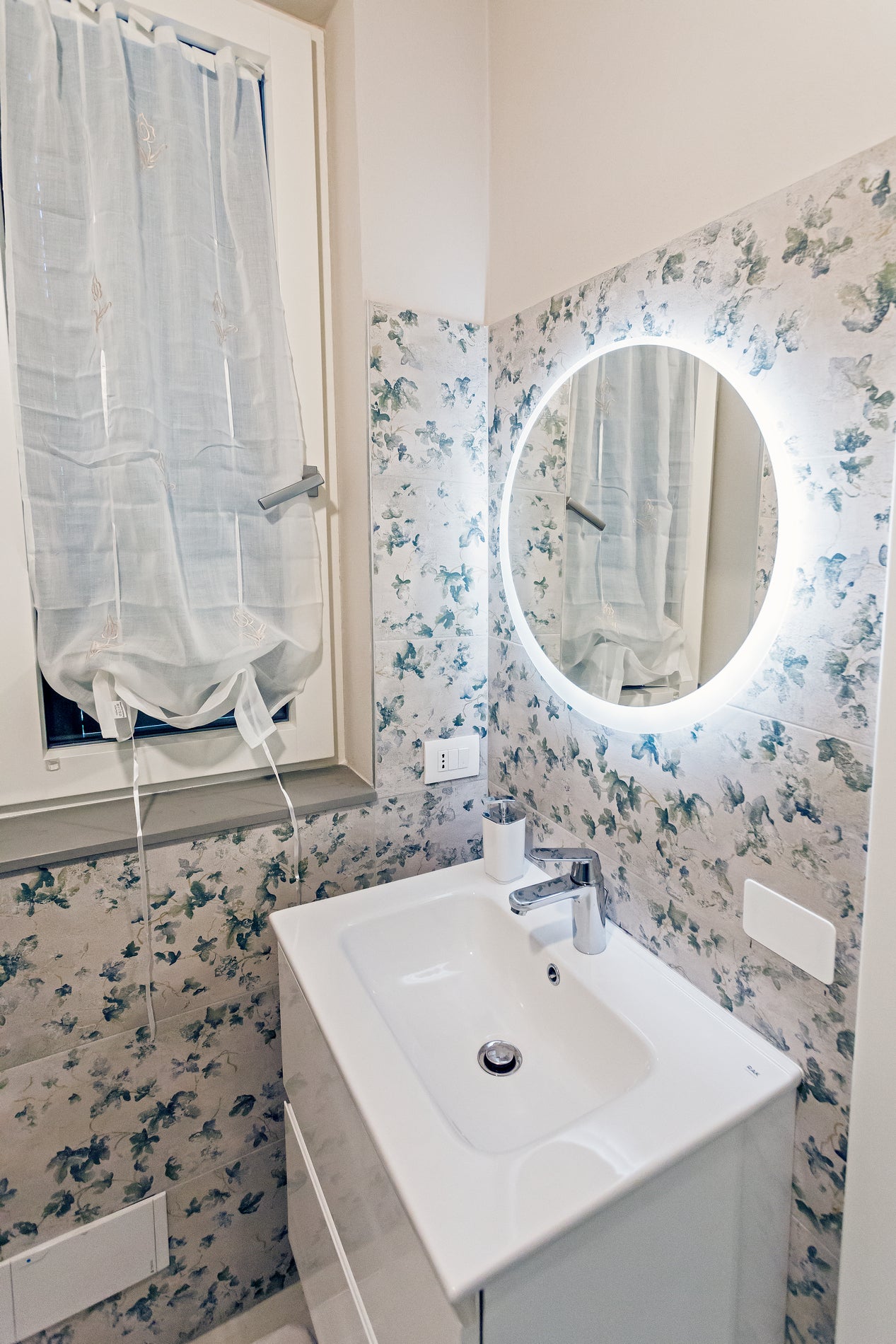 Piastrelle con motivo floreale caratterizzano il bagno interno e creano un'atmosfera fresca e rilassante, richiamando la bellezza campestre.