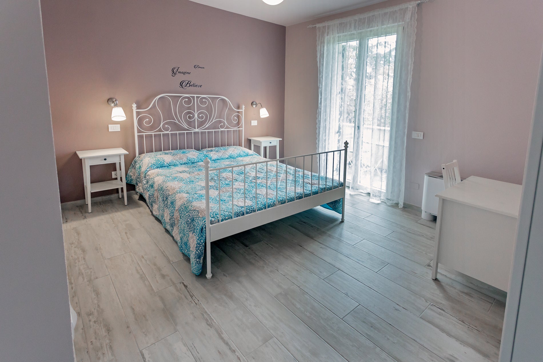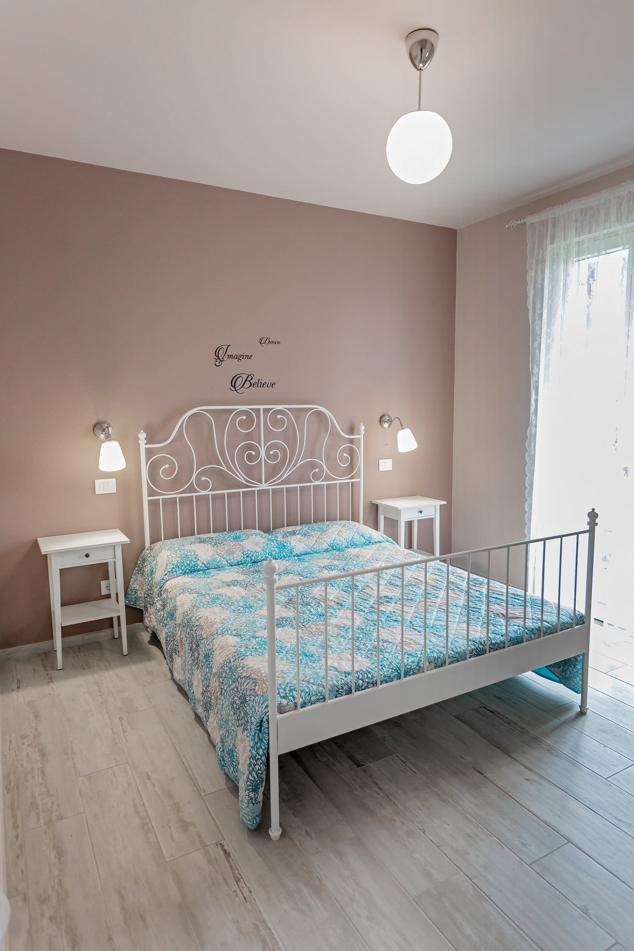 La stanza è provvista di un comodo letto king size con doghe, comodini di legno chiaro, due graziose lampade con paralume, wi-fi, infissi con doppi vetri e zanzariere.