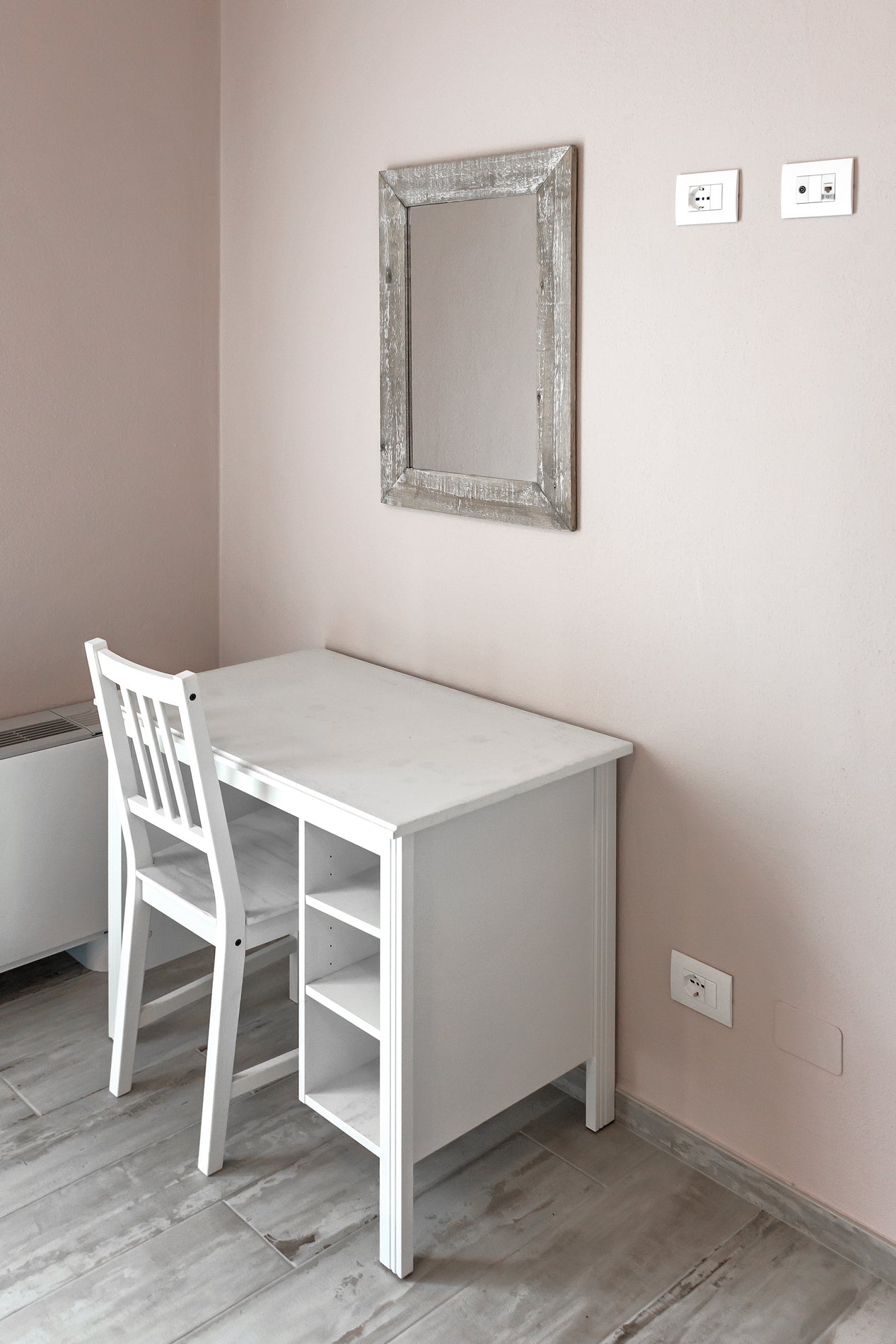 La stanza da bagno vanta un ampio box doccia, preziose piastrelle, sanitari sospesi, un fine specchio a led ed un capiente mobile con cassetti dove riporre i propri effetti personali, in un connubio perfetto di funzionalità ed eleganza. La presenza di una lavatrice all'interno del bagno completa l'ampia gamma di comfort offerti dalla stanza, rendendola perfetta anche per soggiorni prolungati.